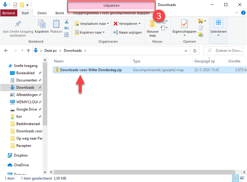 Alle bestanden zijn nu gedownload. Het is nu als 1 pakket gedownload. Een gecomprimeerde map of ZIP-bestand. Zo'n bestand moet je vaak eerst uitpakken. Dat doe je door op "uitpakken" te klikken (3)