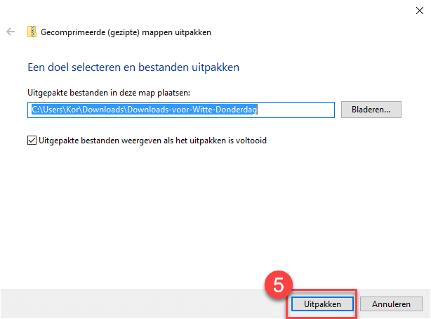 Er komt nu een scherm naar voren die alle bestanden voor je uitpakt. Klik op "Uitpakken"(5)