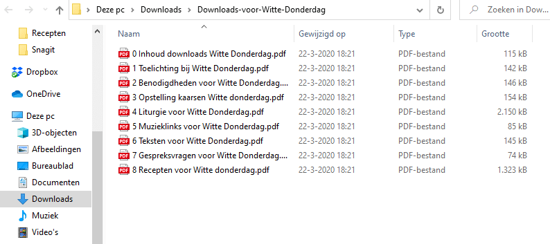 Elke download bestaat uit een aantal pdf-bestanden waarin we uitleggen wat je moet voorbereiden en hoe je de viering houdt. Er zit een liturgie bij die je kunt printen en waar nodig zijn er recepten die je kunt volgen.