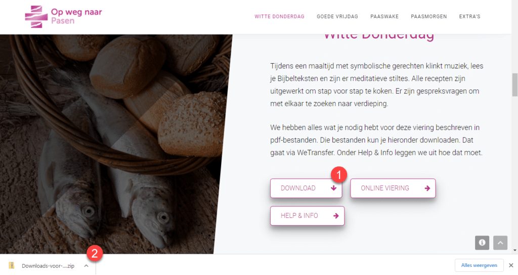 Klik bij de dag waar je de bestanden van wilt downloaden op de knop "Download" (1). Er wordt nu een gecomprimeerde map of ZIP-bestand gedownload. Deze download zie je doorgaans onder in het scherm.